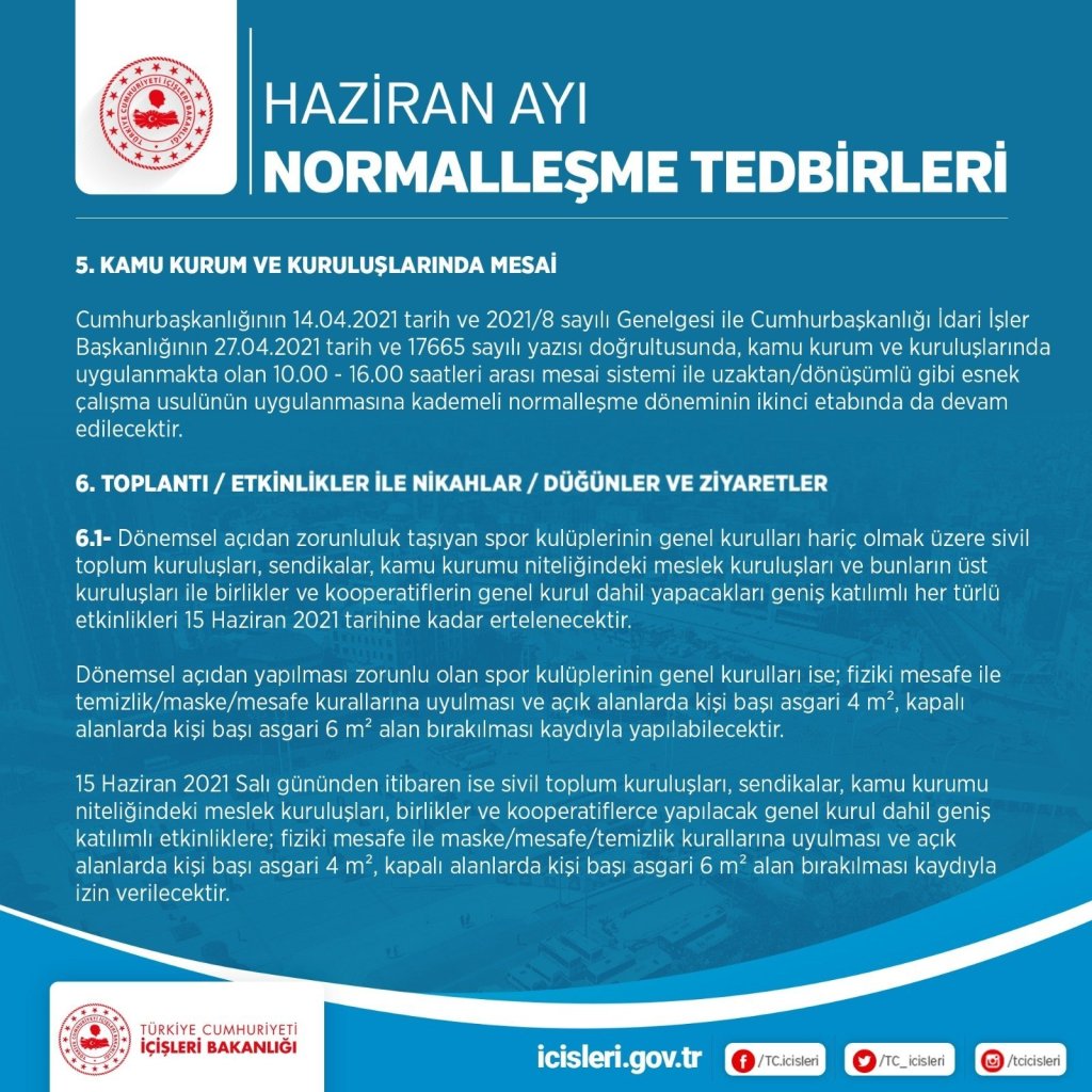 Bu doğrultuda Sağlık Bakanlığı Koronavirüs Bilim Kurulunun tavsiyeleri ve salgının seyrinde yaşanan gelişmeler göz önüne alındığında 17 Mayıs 2021 Pazartesi günü saat 05.00’ten 1 Haziran 2021 Salı günü saat 05.00’e kadar uygulanacak olan kademeli normalleşme döneminde aşağıdaki tedbirlerin hayata geçirilmesi gerektiği değerlendirilmiştir.